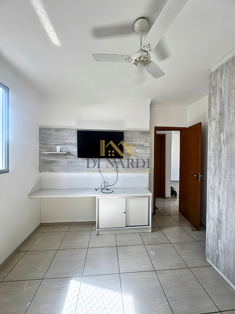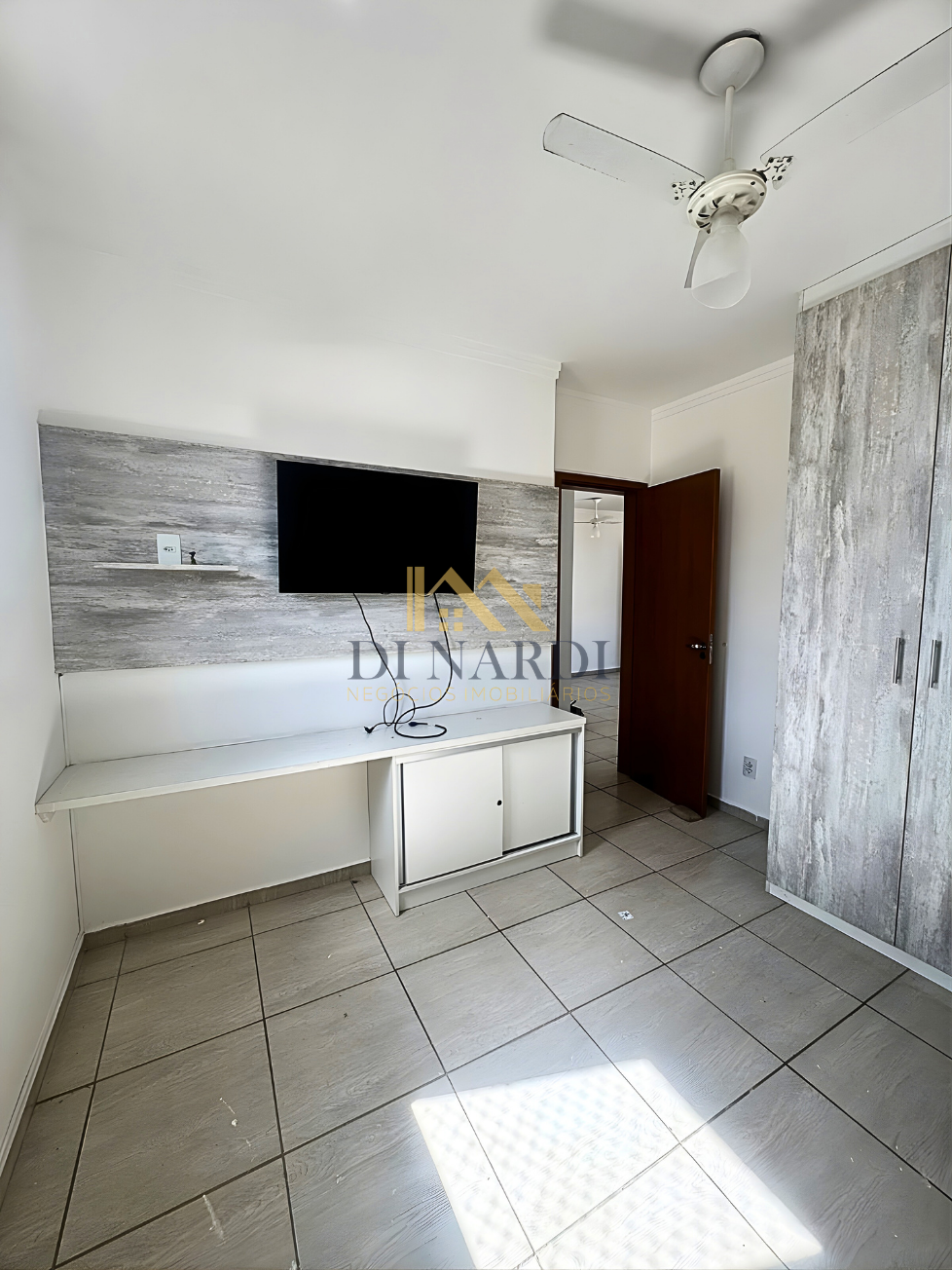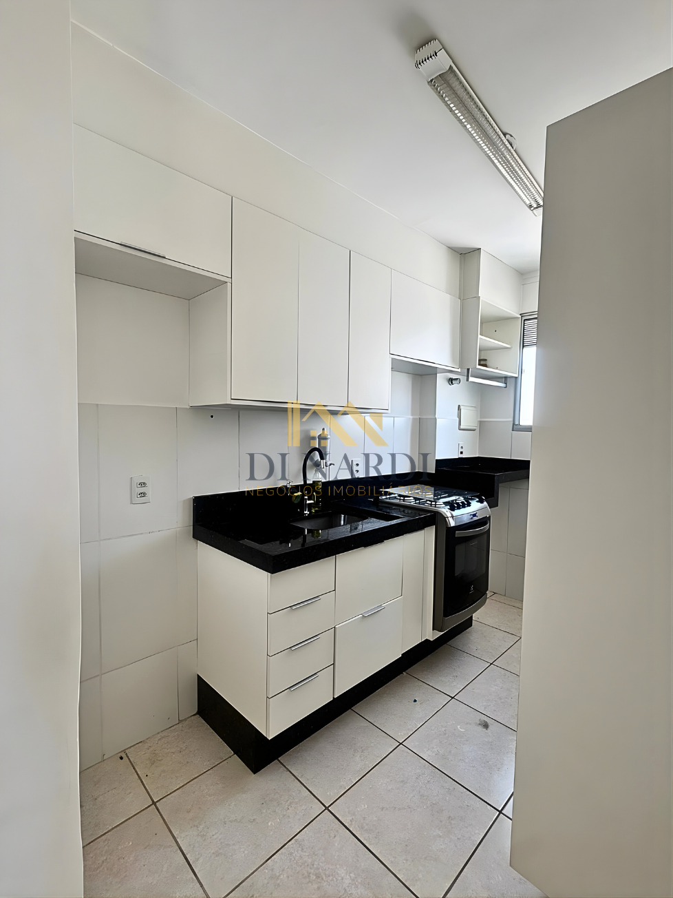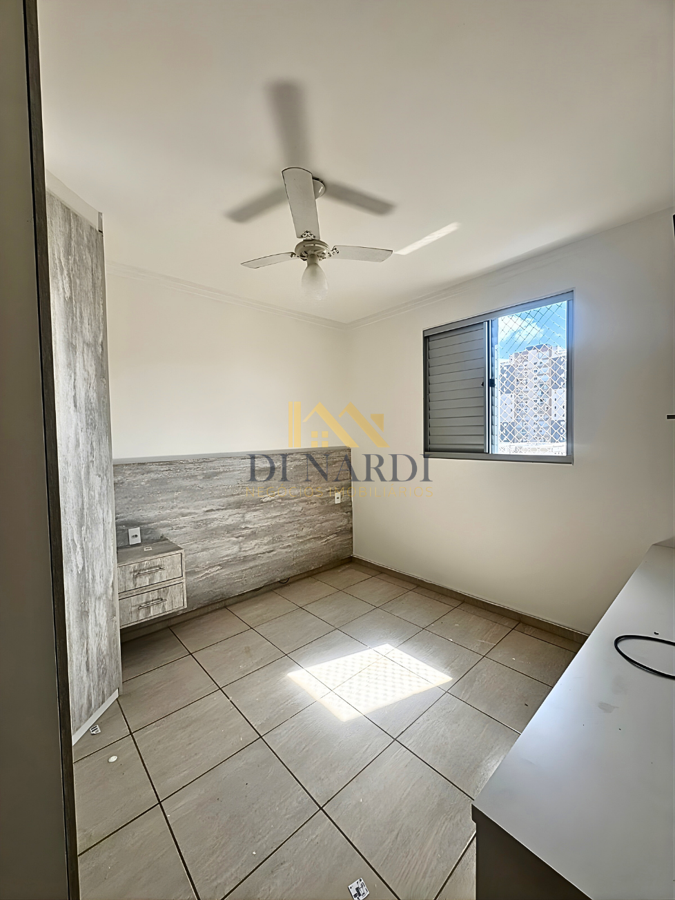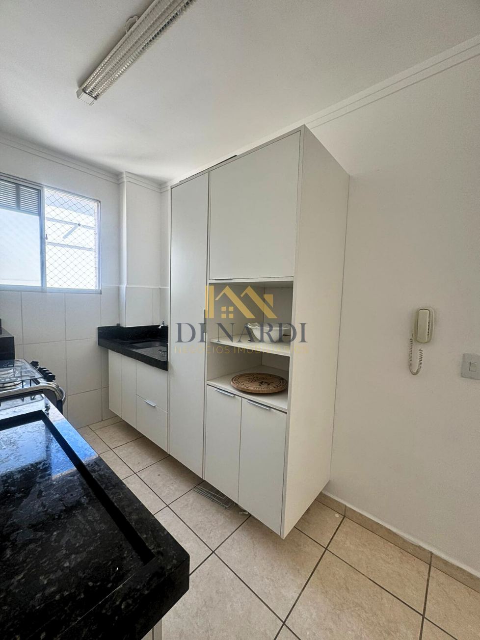 A cozinha já está equipada com móveis planejados e fogão embutido, otimizando seu espaço e orçamento de mudança. O dormitório principal e o banheiro também contam com marcenaria sob medida. Um diferencial importante nesta unidade é a presença de ventiladores de teto e o acesso facilitado por elevador, garantindo conforto em todas as estações.